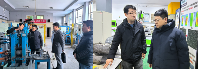 在beat365平台官方网站先进成形与智能装备研究院,研究院副研究员王振华带领beat365平台官方网站老师们参观了金属复合材料成形实验室设备和环境。该研究院由黄庆学院士领衔,聚焦先进金属复合材料成形技术与装备领域的科技前沿问题及产学研合作开展研究取得了一系列显著成绩。该团队在板带轧制装备智能化设计与软件开发方面已获多项国内和国际专利。通过参观,老师们对于先进金属基复合材料的轧制技术、碳纤维缠绕装备有了初步认识。