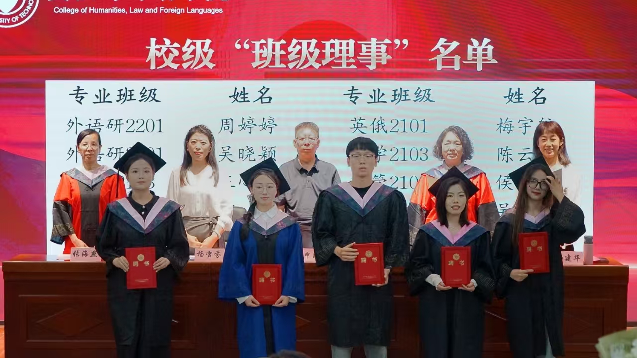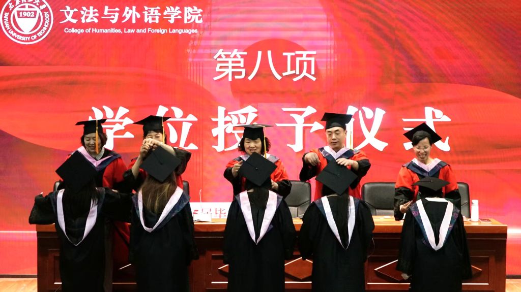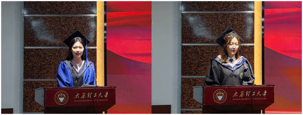 研究生毕业生代表龙皓婕和本科生毕业生代表崔志华分别发言,表达对培养、帮助和关心自己的学院、老师、同学的感激和不舍,也展望未来将时刻牢记“求实创新”的校训,将跨文化沟通能力、法学专业素养分别转化为服务社会的力量,并号召全体毕业生将小我融入大我,肩负起新时代赋予的责任和担当。