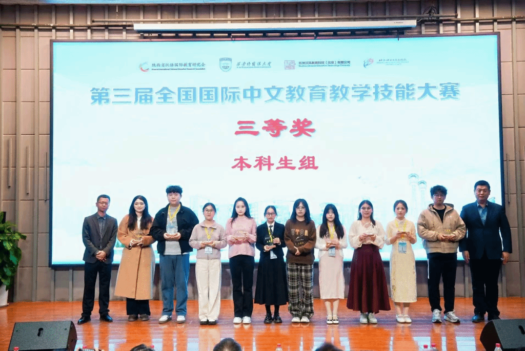 近日,第三届全国国际中文教育教学技能大赛圆满落幕。11月21日-23日,我院刘思彤、李东芳、祝惠芸、何佳薇四位学子在带队教师史钰及指导教师岳莉卿、于融的悉心指导下,肩负学院期望与嘱托前往西安参赛。四位选手凭借扎实的专业学识、精巧的教学设计及出色的临场表现,在全国各高校参赛队伍的激烈角逐中脱颖而出,最终斩获二等奖1项(刘思彤)、三等奖2项(祝惠芸、何佳薇)、优秀奖1项(李东芳)及语音专项奖1项(刘思彤),为学院、学校赢得了荣誉!