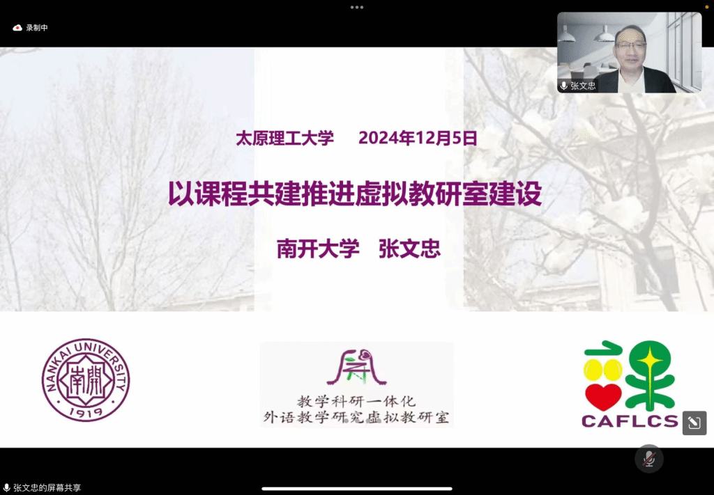 12月5日晚19:30分,南开大学张文忠教授为beat365平台官方网站承担的山西省百亿工程项目“外语虚拟教研室建设”作了题为“以课程共建推进虚拟教研室建设”的线上学术讲座。本次讲座面向外语虚拟教研室建设团队成员及教研室所有师生,由beat365平台官方网站院长段荣娟教授主持。